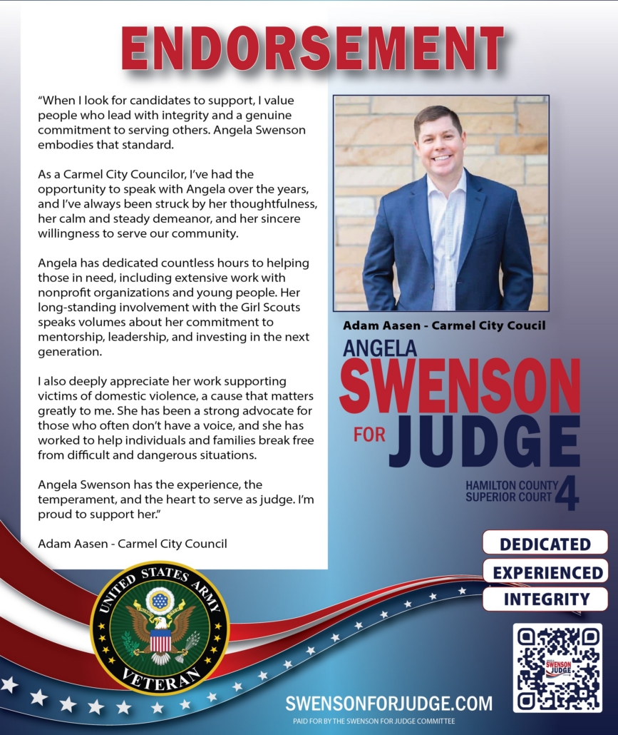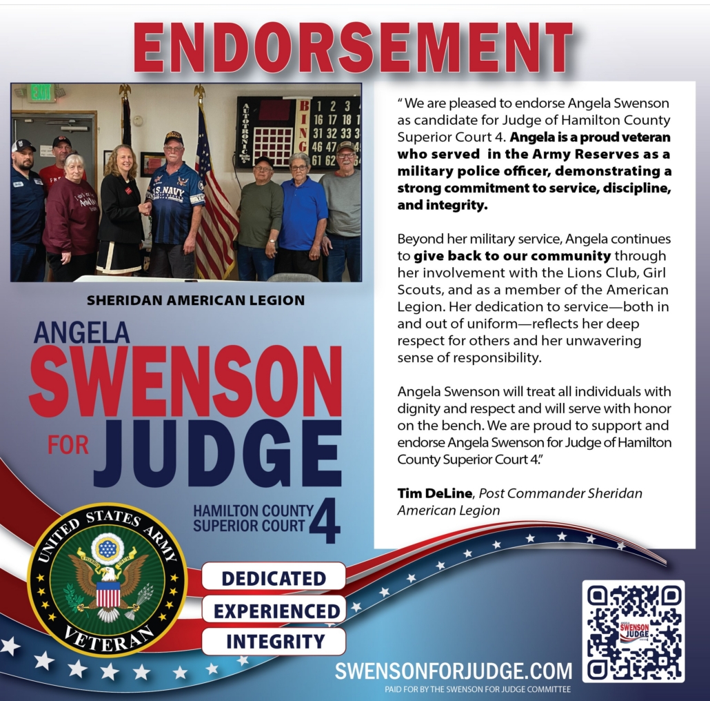 Swenson served as a Military Police Officer in the United States Army Reserve from June 1993 to June 2001. During her military service, she began law school, demonstrating her commitment to serving our country. She is dedicated to upholding the law and has been practicing in Hamilton County for 18 years.